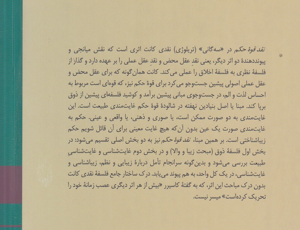 نقد قوهٔ حکم در «سهگانی» (تریلوژیِ) نقدیِ کانت اثری است که نقش میانجی و پیونددهندهٔ دو اثر دیگر، یعنی نقد عقلِ محض و نقدِ عقلِ عملی را برعهده دارد و گذار از فلسفهٔ نظری به فلسفه اخلاق را عملی میکند. کانت همانگونه که برای عقل محض و عقل عملی اصولی پیشین جُستوجو میکرد برای قوهٔ حکم نیز، که قوهای است مربوط به احساس لذت و الم، در جُستوجوی مبانی پیشین برآمد و کوشید فلسفهای پیشین از ذوق برپا کند. مبنا یا اصل بنیادی نهفته در شالودهٔ قوهٔ حکم غایتمندی طبیعت است. این غایتمندی به دو صورت ممکن است، یا صوری و ذهنی یا واقعی و عینی. حکم به غایتمندی صورت یک عین بدون آنکه هیچ غایت معینی برای آن قائل شویم حکم زیباشناختی است و اگر غایت معینی برای آن درنظر بگیریم حکم غایتشناختی است. بر همین مبنا، نقد قوهٔ حکم نیز به دو بخش اصلی تقسیم میشود: در بخش اول فلسفهٔ ذوق (مبحث زیبا و والا) و در بخش دوم غایتشناسی و غایتشناسیِ طبیعت بررسی میشود و بدینگونه سرانجام تأمل دربارهٔ زیبایی و نظم، زیباشناسی و غایتشناسی، در یک کل واحد، بههم پیوند مییابد. درک ساختار جامع فلسفهٔ نقادی کانت بدون درک مباحث این اثر، که به گفتهٔ کاسیرر «بیش از هر اثر دیگری عصب زمانهٔ خود را تحریک کرده است» میسر نیست.
